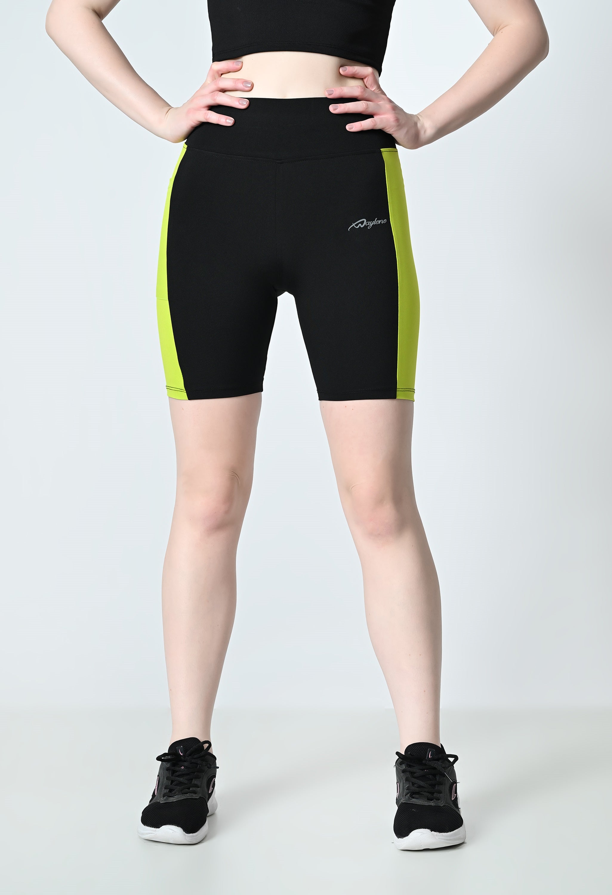 Discover the fusion of style and functionality with Waylene's Black and Parrot Green Colour Block Gym Shorts for Women. These high-performance shorts are crafted to support your active lifestyle, whether you're hitting the gym or the yoga mat. With a stylish slim-fit design and moisture-wicking dry-fit technology, they ensure you stay comfortable and confident.